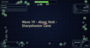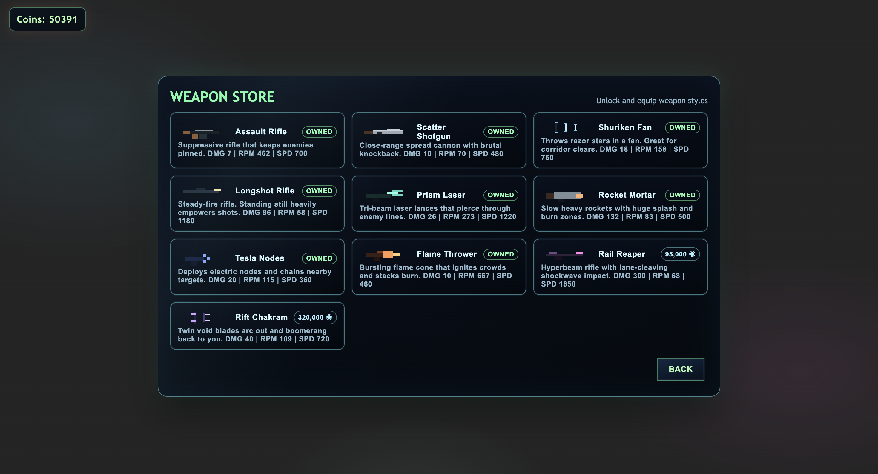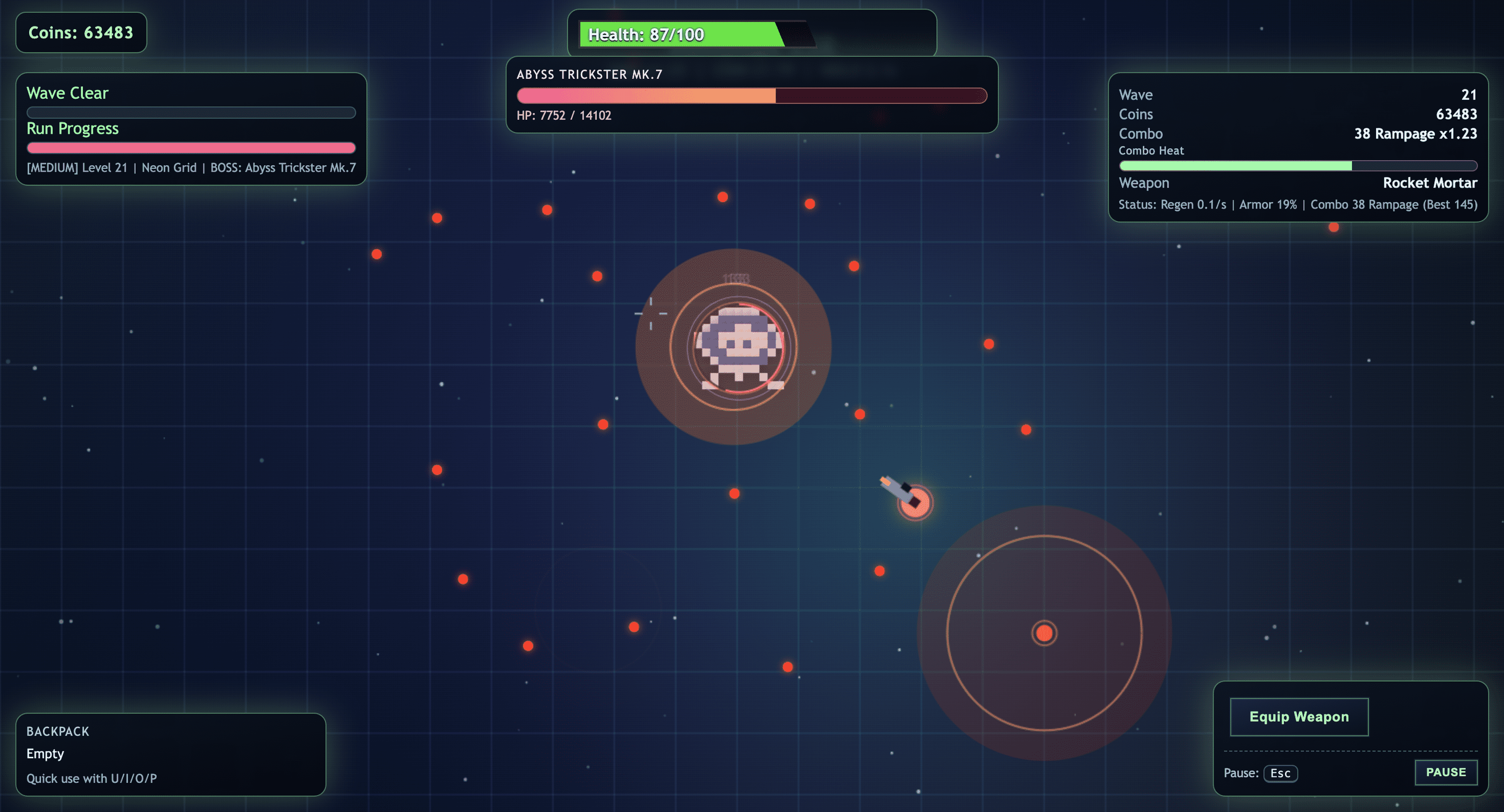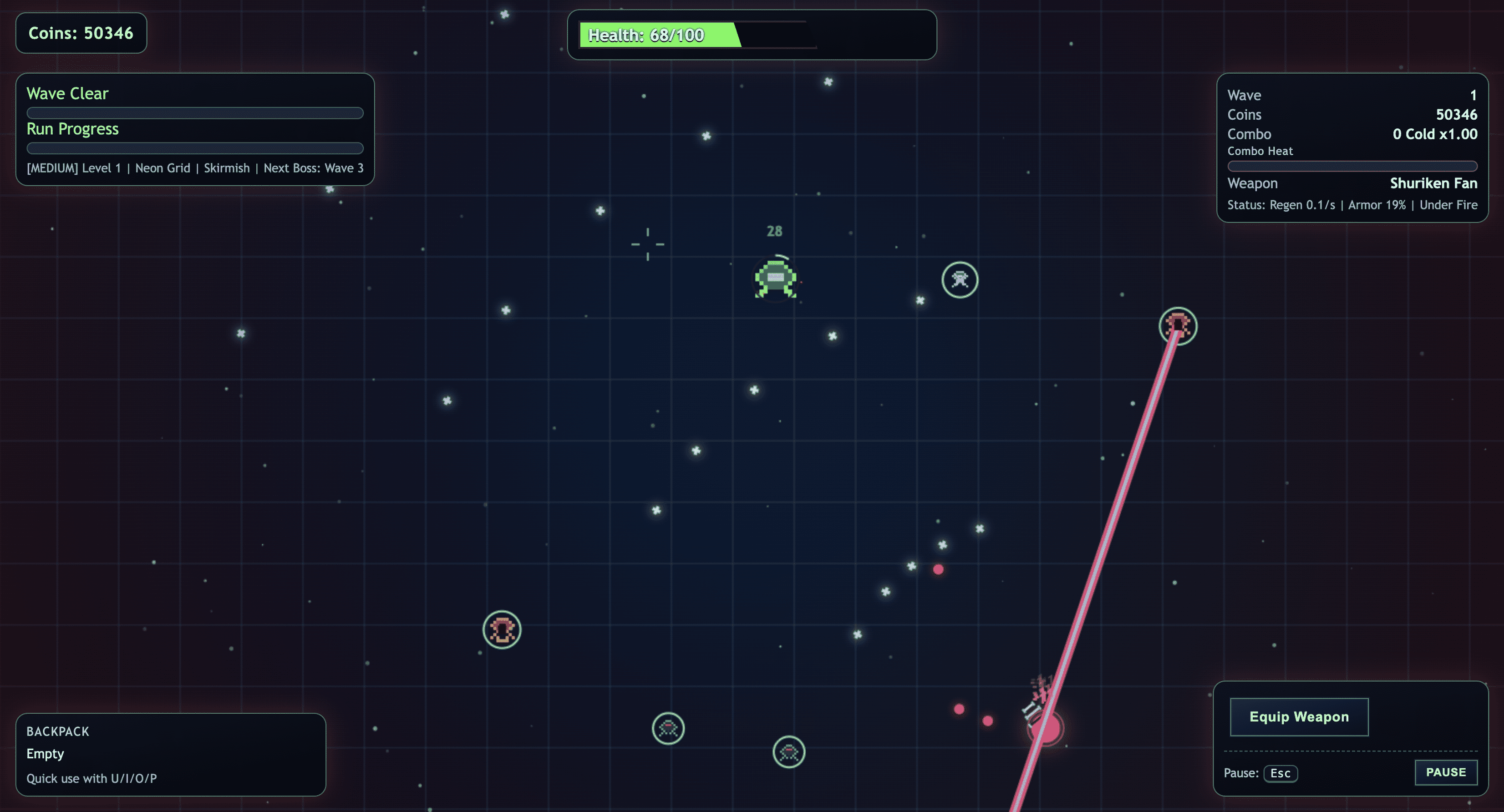 Enemies appear in waves, and every third wave is a boss with unique attacks. Defeating a boss lets you choose a reward that makes your character stronger. Enemies drop coins, which can be spent between runs to unlock new weapons and permanent upgrades. You can pause the game at any time by pressing Esc or using the on-screen pause button.