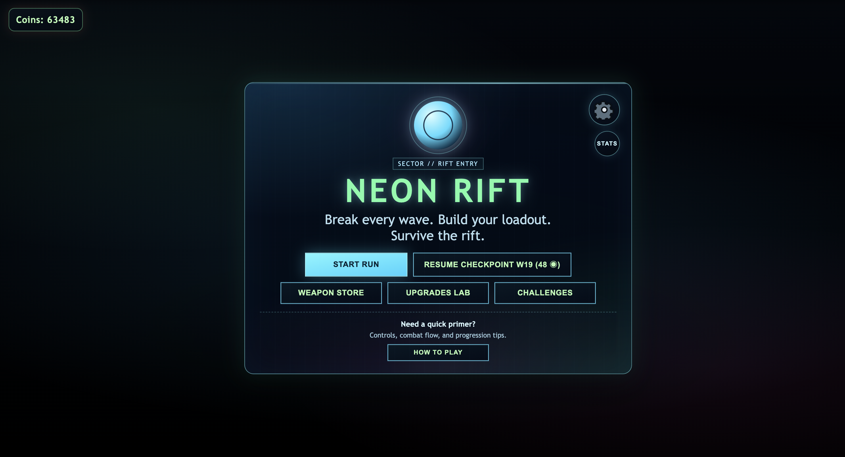 Neon Rift is a fast-paced top-down shooter where the goal is to survive as many enemy waves as possible. You move your character using the W, A, S, and D keys and shoot by clicking the mouse or pressing the spacebar.